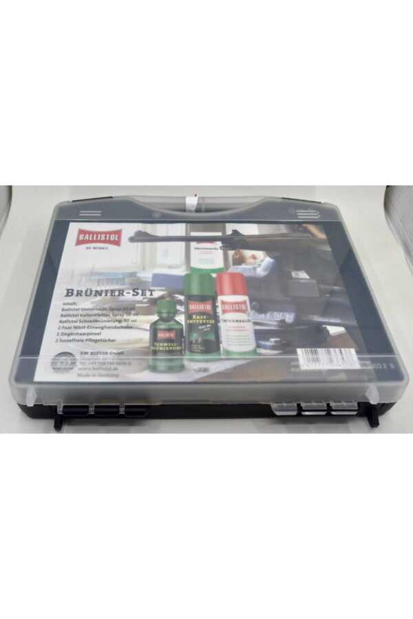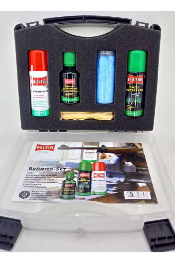 Ballistol Brünier Bakım Seti Hazırlıktan uygulamaya ve korumaya kadar Tüm Kaplar Bir Sette BALLISTOL Evrensel Yağ Spreyi 50 ml ; ROBLA soğuk yağ çözücü 50 ml ; Hızlı esmerleşme 50 ml ; 2 çift nitril tek kullanımlık eldiven ; 2 keçi kılı fırçası ; 2 tüy bırakmayan temizlik bezi ; Mevcut olanlar: Ballistol Universal Yağ Spreyi, 50ml Soğuk Yağ Çözücü Sprey. 50ml Quickbrowning, 50ml 2 çift tek kullanımlık eldiven 2 gloat saç fırçası 2 tüy bırakmayan mendil