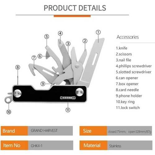 Grand Harvest Multi tool ergonomik tasarım ve zengin işlevselliği birleştiren çok amaçlı bir alettir. Çok amaçlı aletin avantajları arasında yaylı pense, çelik delikli sap ve cep klipsinin varlığı not edilebilir. Çok amaçlı alet bir naylon kapakla donatılmıştır.