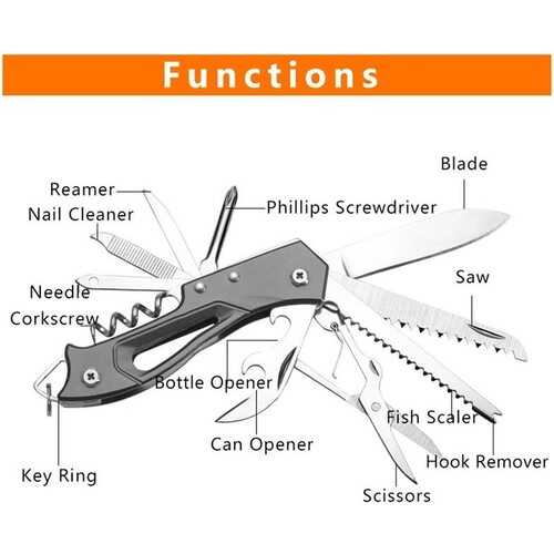* İğne içerir-kargaburun, tel kesiciler, tel kesiciler, tıbbi acil pense ve diğer fonksiyonlar.