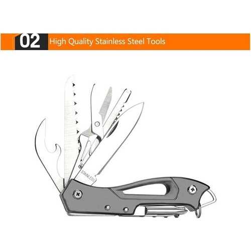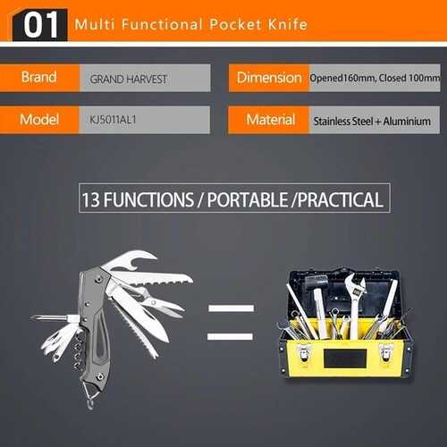 Grand Harvest Multi tool ergonomik tasarım ve zengin işlevselliği birleştiren çok amaçlı bir alettir. Çok amaçlı aletin avantajları arasında yaylı pense, çelik delikli sap ve cep klipsinin varlığı not edilebilir. Çok amaçlı alet bir naylon kapakla donatılmıştır.