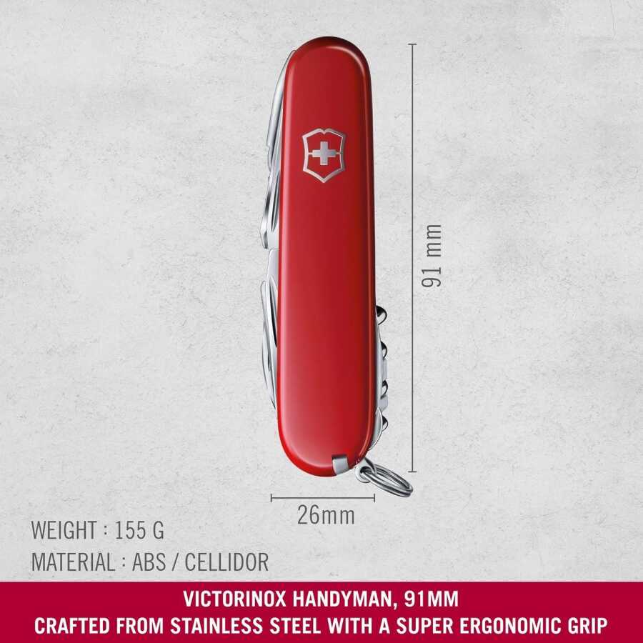Renk : Kırmızı ; Uzunluk : 91mm ; Genişlik : 27mm ; Yükseklik : 28mm ; Ağırlık : 155gr ; ; Fonksiyonlar ( 24 ) ; Büyük Bıçak ; Küçük Bıçak ; Konserve Açacağı ; Tornavida 3mm ; Şişe Açacağı ; Kablo Sıyırıcı ; Tornavida 6mm ; Delik Açıcı ; Tirbüşon ; Makas ; Kerpeten ; Tel Kesici ; Tel Kıvırıcı ; Ağaç Testeresi ; Tırnak törpüsü ; Metal Testeresi ; Metal Törpüsü ; Tırnak Temizleyici ; Tornavida 2,5mm ; Keski 4mm ; Çok Amaçlı Kanca ; Kürdan ; Cımbız ; Anahtarlık Halkası ;